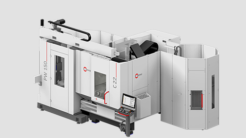 PW 150 — паллетная система для C 22 GEN2 и других машин среднего класса. Двухпозиционный паллетный переход, оптимизирован для грузоподъемности до 300 кг. Обеспечивает непрерывное производство с высокой повторяемостью позиционирования.