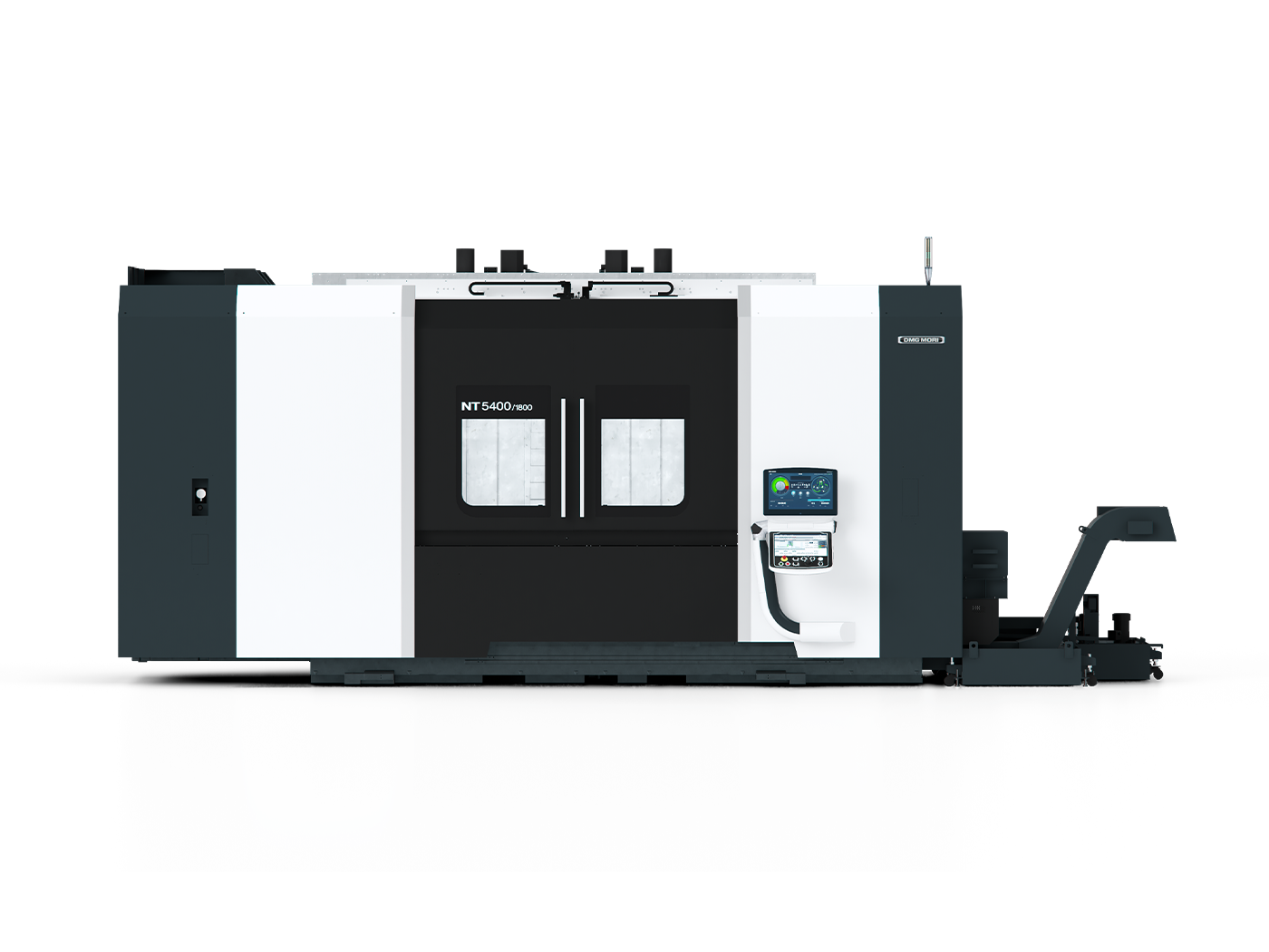 NT 5400 DCG / 1500 SZM — тяжелый токарно-фрезерный центр для крупных деталей ø920 мм. Патрон 15 дюймов. Главный шпиндель 2400 об/мин с осью C (точность 0.0001°). Токарно-фрезерный шпиндель 8000 об/мин. B-ось с прямым приводом: поворот 110°, диапазон ±120°. Технология DCG (Driven at Center of Gravity) для минимальных вибраций. Y-ось 200 мм. Многоосевой центр для сложных операций. Пруток 103 мм. Расстояние между центрами 1500 мм.