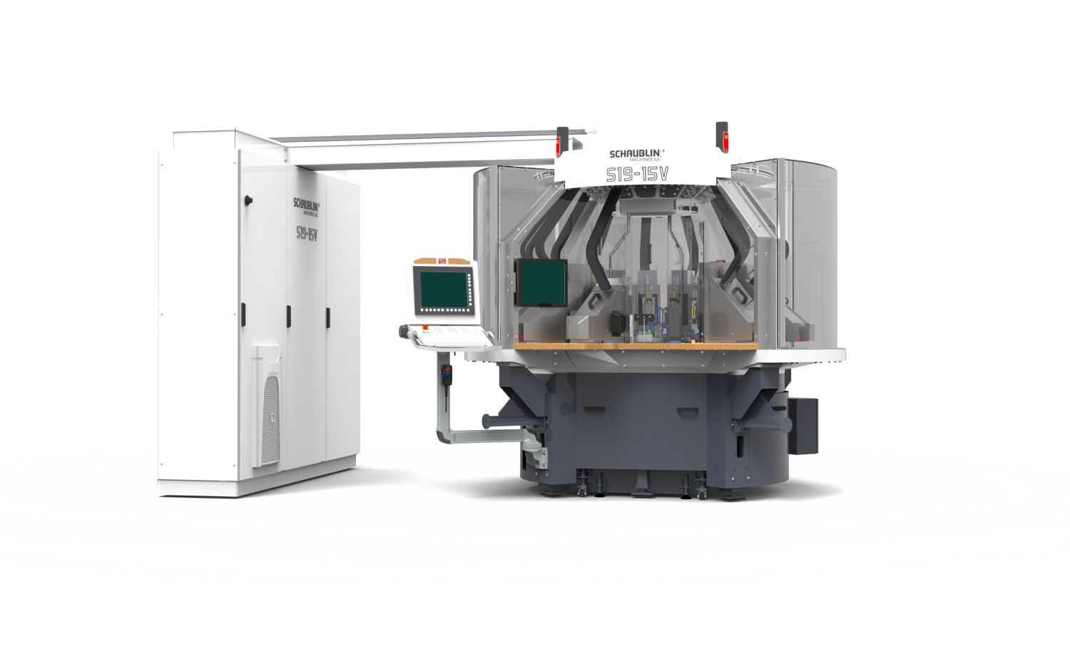 S19-15V — высокоточная CNC роторная трансферная машина с 15 станциями (12 обрабатывающих). Модульная конструкция от 6 станций, 24 режущих инструмента, время индексации 1.5 сек. Площадь менее 20 м² с роботизацией. Мировая премьера EPHJ 2024.