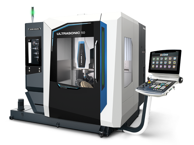 ULTRASONIC 50 — универсальный 5-осевой центр с ультразвуком (650×520×475 мм, 300 кг). Шпиндель 15000-20000 об/мин/200 Нм, амплитуда ультразвука 15 мкм. Снижение усилия до 50%, microDRILL 32000 об/мин, магазин 30-120 инструментов.