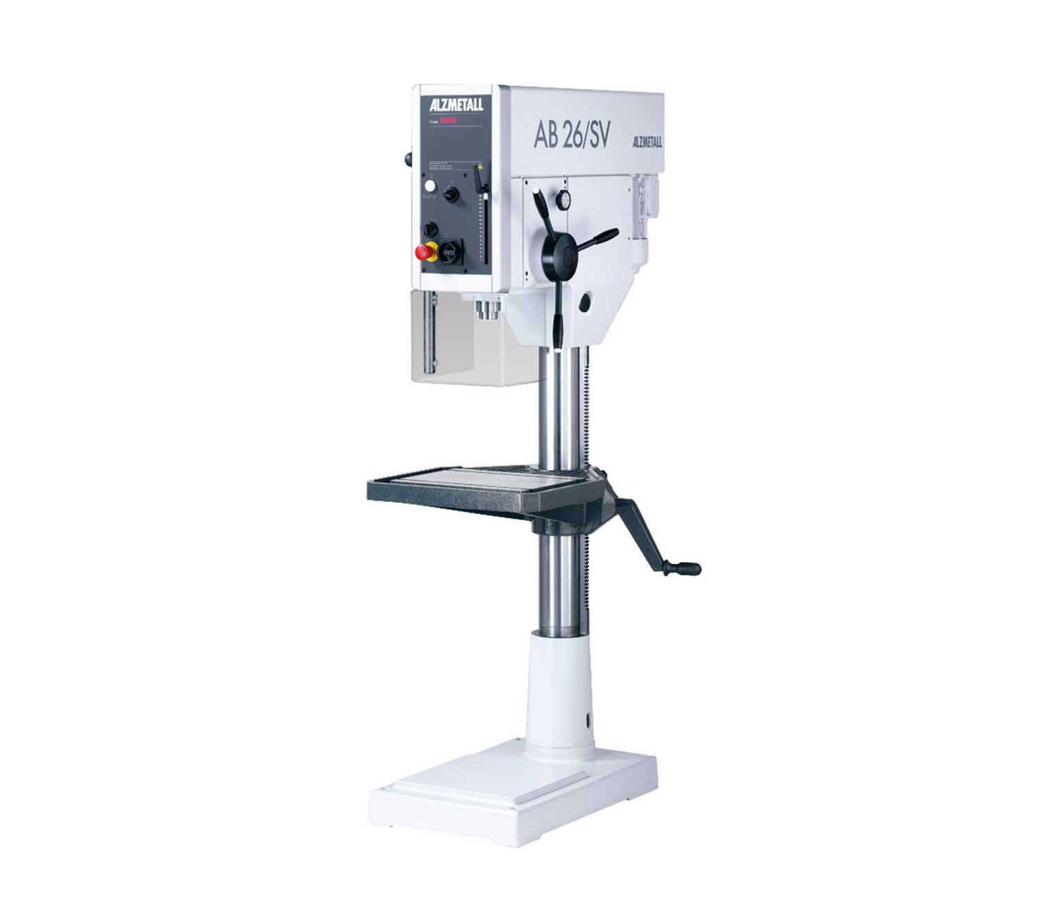 AB 26/SV — колонный сверлильный станок ALZMETALL с электромагнитной муфтой подачи и производительностью Ø30 мм в стали. Бесступенчатая регулировка 120-2200 об/мин. Шпиндель MT 3 с увеличенным ходом 160 мм. Колонна Ø115 мм, стол 515×360 мм. Резьба M20. Двигатель 1,0/1,6 кВт. Автоматическая подача с электромагнитной муфтой.