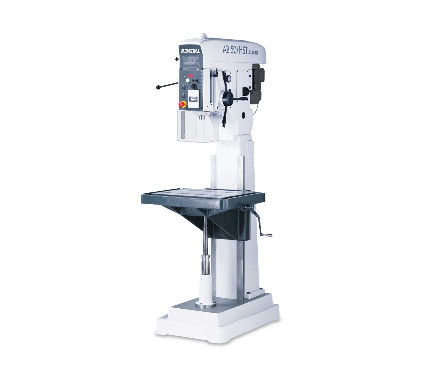 AB 50/HST — самый мощный полузакрытый (semi-box) колонный сверлильный станок промышленного класса для высокопроизводительного сверления до Ø60 мм в стали E335. Нарезание резьбы до M42. Два диапазона скорости: 60-1530 об/мин (опция 1) или 50-1280 об/мин (опция 2) — оптимизированы для крупных диаметров и экстремальных нагрузок.