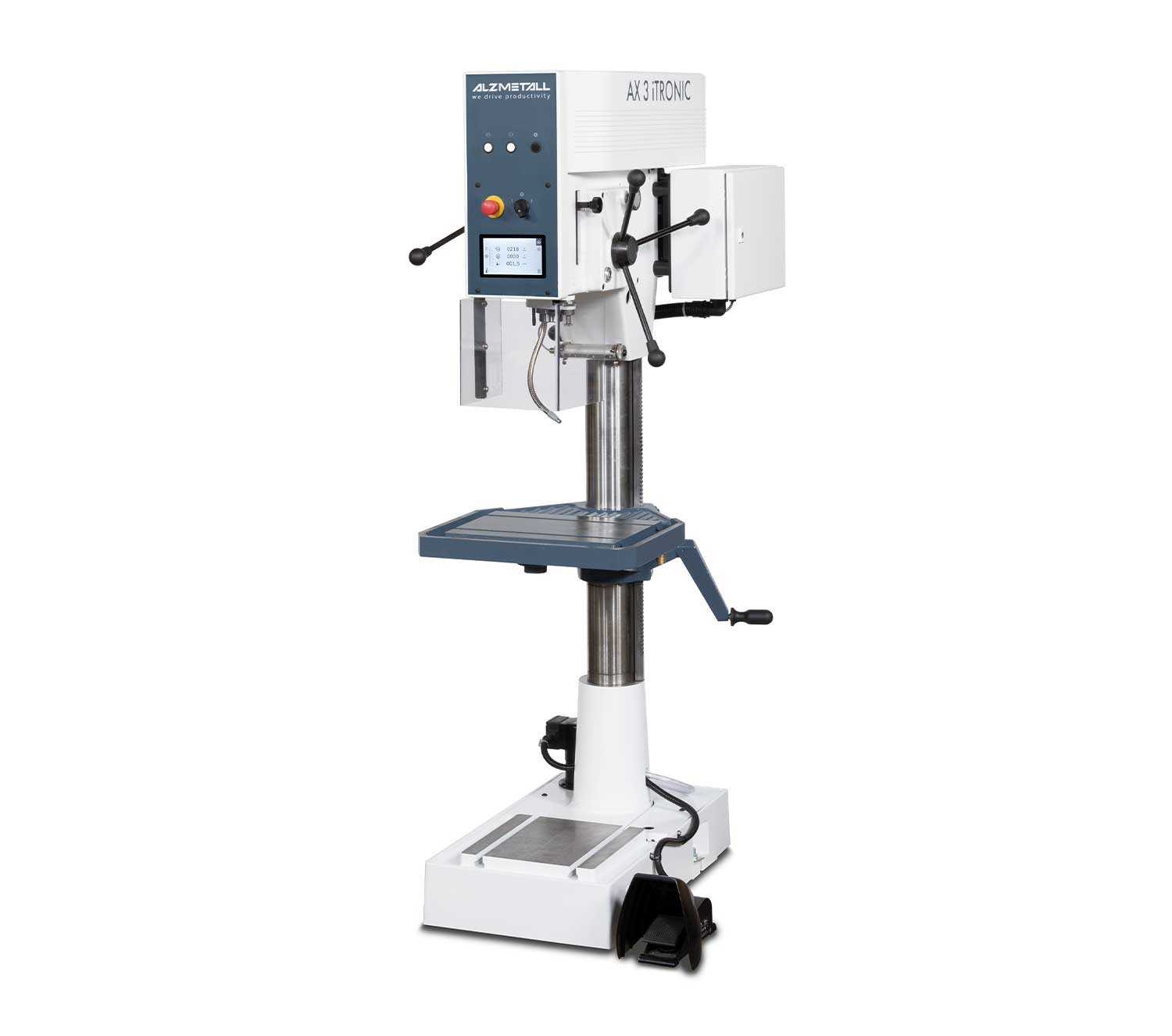 AX 3 iTRONIC — мощный колонный сверлильный станок TOP-QUALITY с 7" TFT LCD Multi-Touch дисплеем для высокопроизводительного сверления до Ø40 мм в стали E335. Нарезание резьбы до M24. Бесступенчатая регулировка скорости через iTRONIC систему в двух диапазонах: 80-1125 об/мин (опция 1) или 160-2250 об/мин (опция 2) — оптимизированы для крупных диаметров и различных режимов резания.
