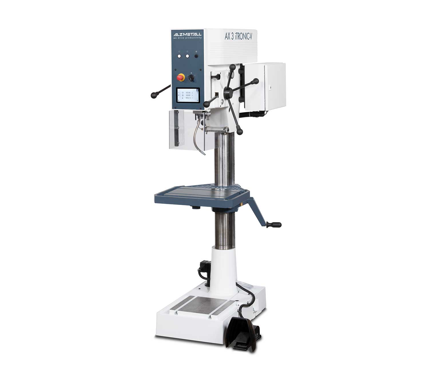 AX 3 iTRONIC-V — мощный колонный сверлильный станок ALZMETALL TOP-QUALITY с 7" Multi-Touch и автоматической подачей для сверления до Ø40 мм. Шпиндель MT 4. Защита подачи от перегрузки. Два диапазона 80-1125 или 160-2250 об/мин. Ход 120 мм. Колонна Ø115 мм, стол 515×360 мм. Резьба M24. Двигатель до 1,45/1,9 кВт.