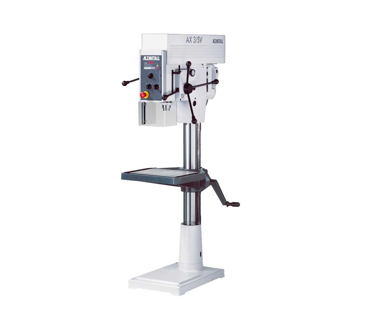 AX 3/SV — мощный колонный сверлильный станок ALZMETALL TOP-QUALITY с автоматической подачей и производительностью Ø40 мм в стали. Бесступенчатая регулировка 80-1125 или 160-2250 об/мин. Шпиндель MT 3, усиленная колонна Ø115 мм, стол 515×360 мм. Резьба M24. Двигатель до 1,45/1,9 кВт. Муфта подачи.