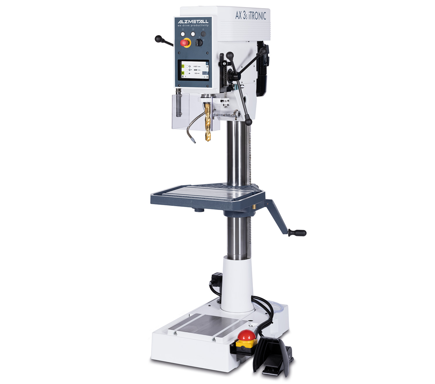 AX 3s iTRONIC — компактный колонный сверлильный станок ALZMETALL TOP-QUALITY с 7" Multi-Touch для сверления до Ø30 мм. Автореверс без ножной педали. Бесступенчатая регулировка 225-4300 об/мин. Шпиндель MT 3, ход 140 мм. Колонна Ø115 мм, стол 515×360 мм. Резьба M16. Двигатель 1,0/1,6 кВт. Управление 24В. Компактная версия AX 3 iTRONIC для универсальных работ.