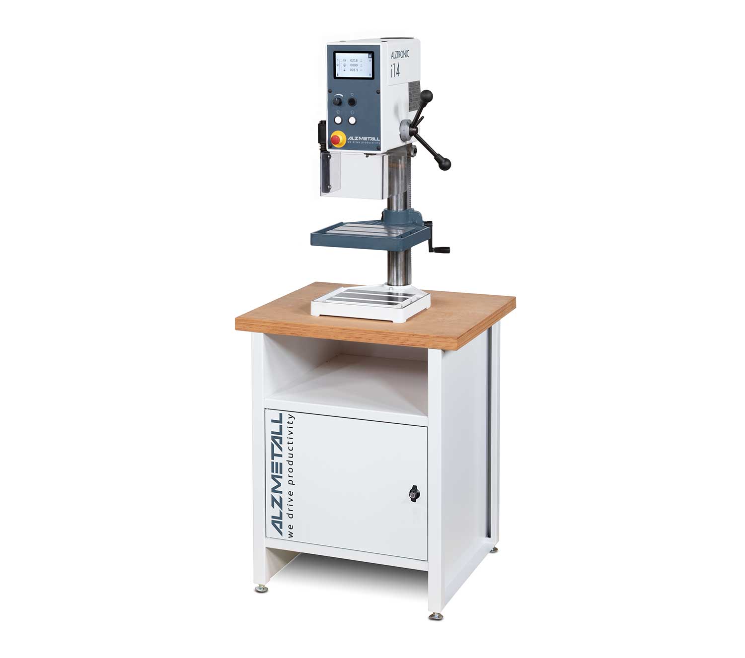 ALZTRONIC i14 — компактный электронный настольный станок для сверления до Ø14 мм в стали E335. Опциональная резьба до M10. Бесступенчатая регулировка 230-4000 об/мин. Сенсорный дисплей (Touchscreen). Шпиндель MT 2 короткий.