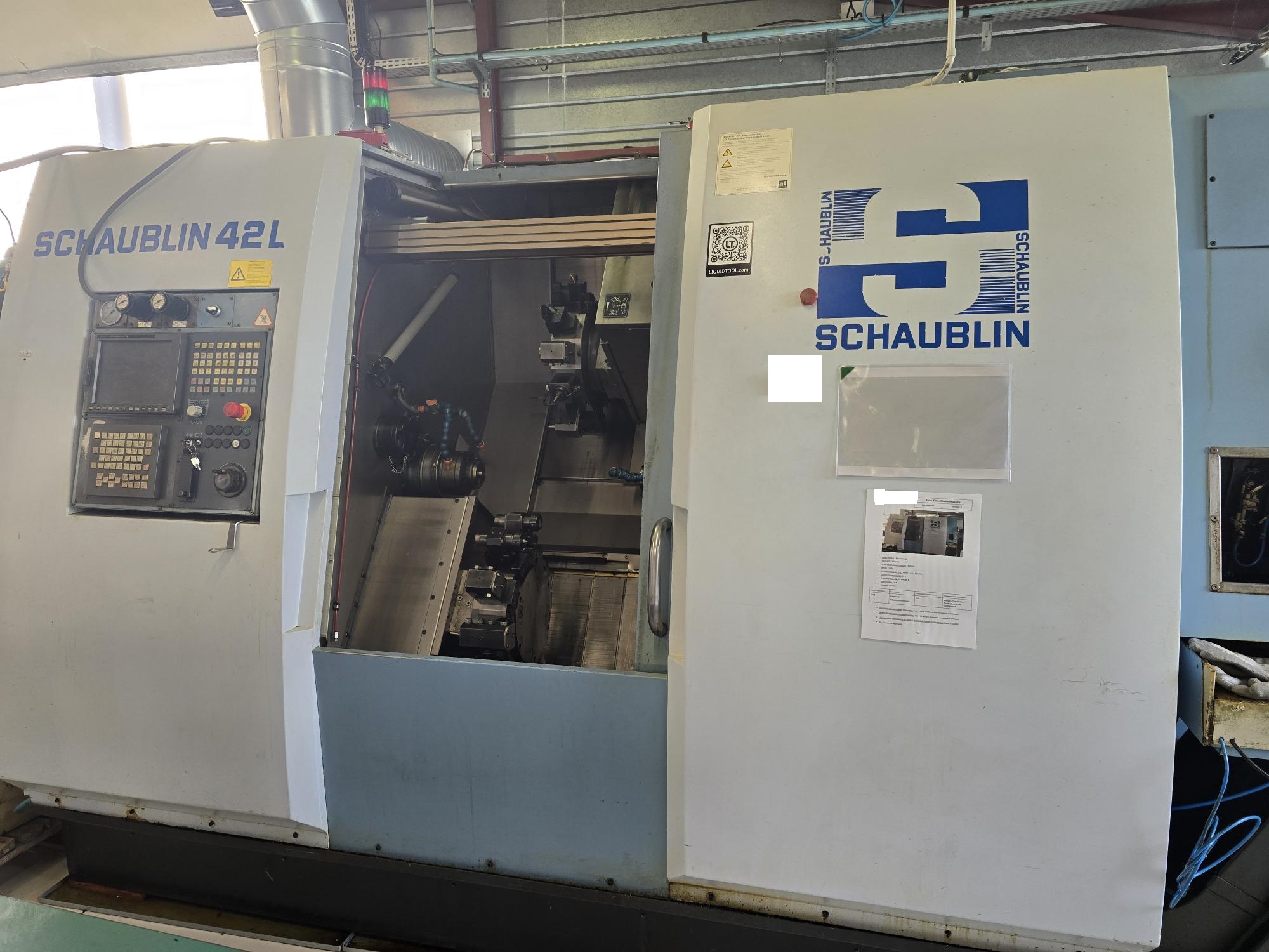 SCHAUBLIN 42L TMi-6Y — прутковый токарный автомат для серийного производства. Проход прутка 42 мм, длина обработки 350-460 мм. Главный шпиндель 4000-6000 об/мин со встроенным двигателем. Противошпиндель 6000 об/мин, 7.5/11 кВт. Двойная револьверная головка VDI 25/30 по 12 позиций. Оси: X: 170-200 мм, Z: 350-500 мм, Y: ±55 мм. FANUC 18i / 18i-TB. Совместимость с пруткоподатчиками IEMCA BOSS 545.
